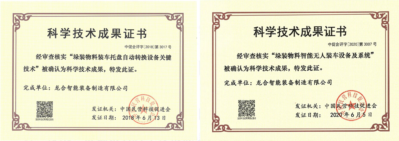 龍合智能的創新設計通過國家科技部授權的權威機構認證為科學技術成果,已擁有眾多知識產權技術專利,共計獲得國家專利269項(其中發明專利35項),獲得軟件著作權57項,知識產權自主可控。實現了無人化、自動化、信息化和智能化裝卸作業的行業零的突破。